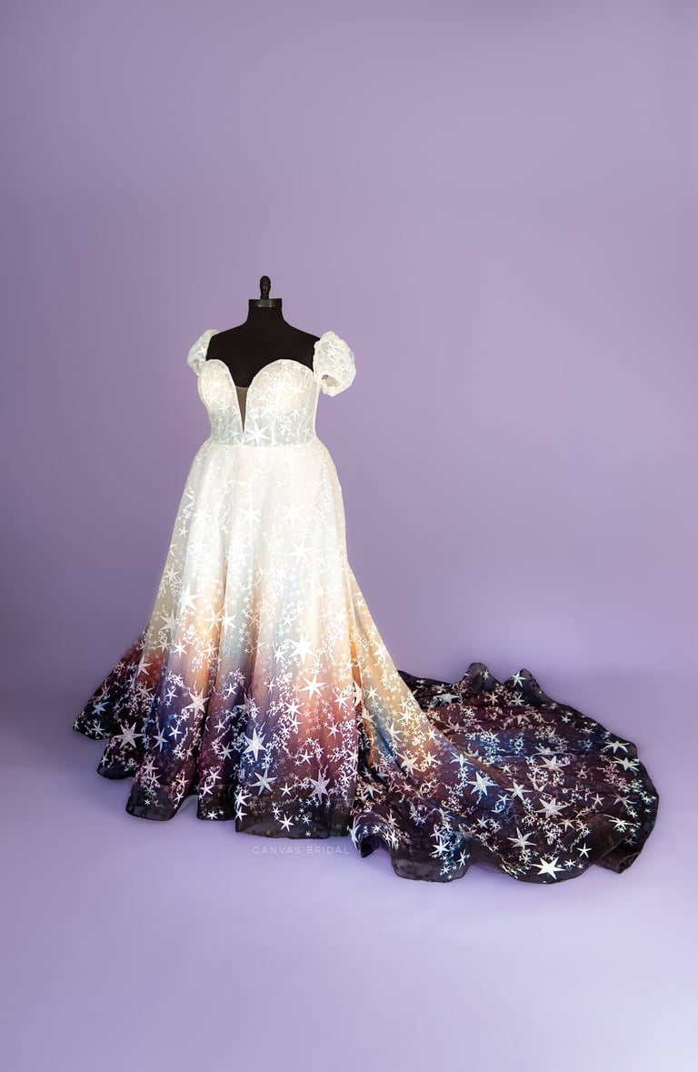 I'm an artist who uses bridal wear as my canvas. I have a limited selection of finished works available to purchase online, or you can come try them on at my private studio in Kansas City, Missouri.